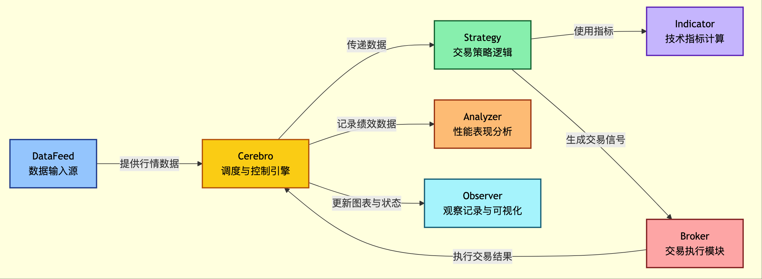 首先,由 DataFeed 提供行情数据,Cerebro 将数据传递给 Strategy。策略读取数据并调用 Indicator 计算技术信号,据此生成买卖决策并交由 Broker 执行交易。交易完成后,Broker 更新账户与持仓,并将结果反馈给 Cerebro。