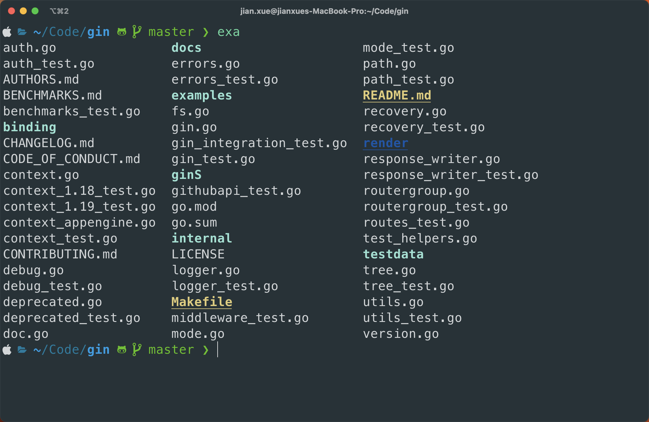 首先是全名匹配,通过 zoxide 的 cd 命令,在 ~ 目录下快速跳转到 golang-examples 目录,直接输入 cd golang-examples。